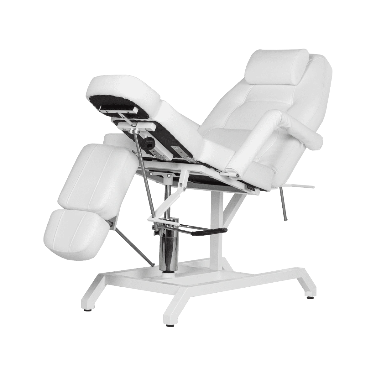 • Кресло оснащено мощным гидравлическим механизмом, который регулирует угол наклона кресла, это позволяет высоко поднимать ногу для удобства работы мастера и в тоже время обеспечивает комфортное расположение клиента.