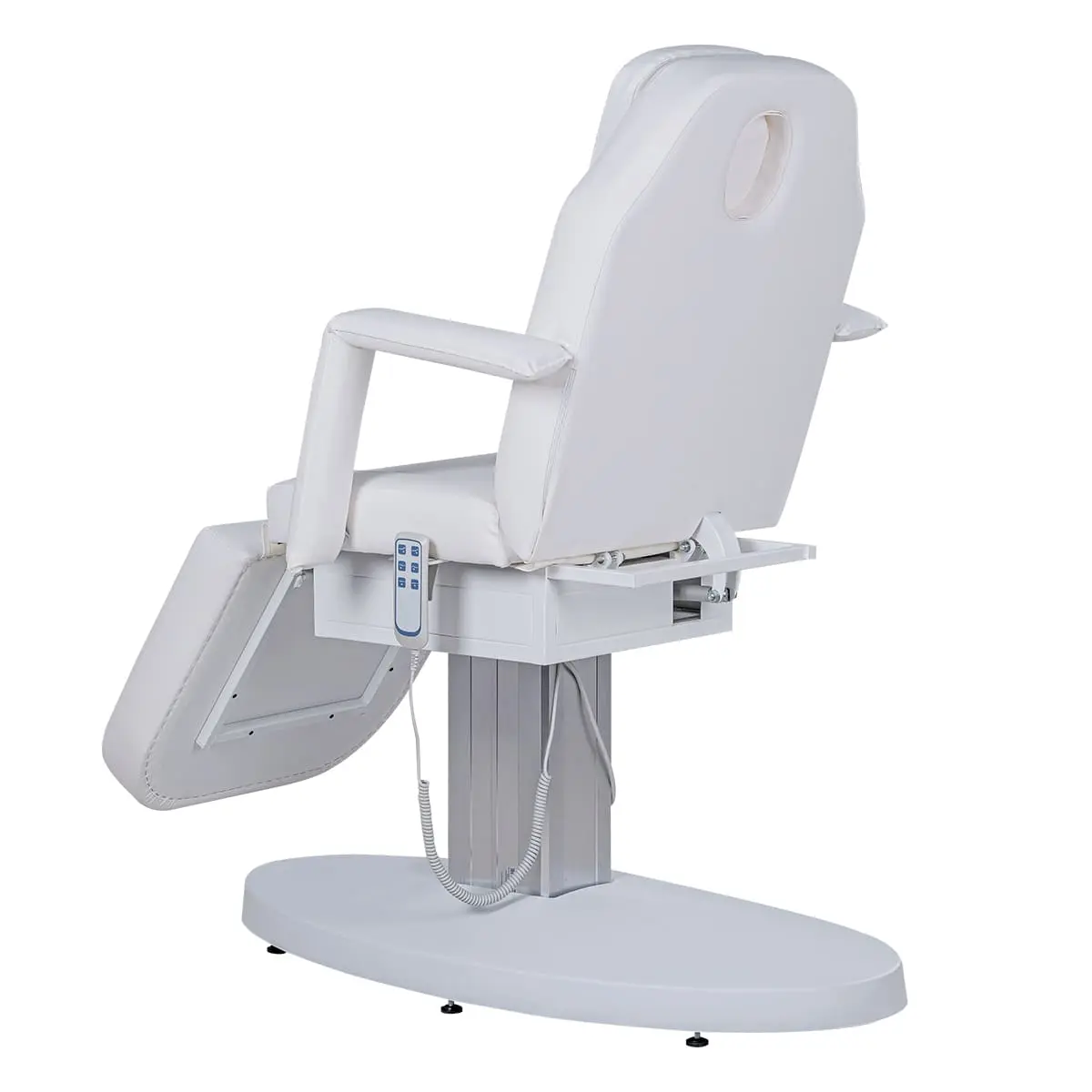 Кресло косметологическое Элегия-03 на колонне (Элегия-2) комплектуется тремя моторами электропривода, которые позволяют быстро и с комфортом для клиента менять положение мягких элементов. Пользуясь регулировками, мастер может трансформировать кресло в горизонтальное положение и использовать его в качестве косметологической или массажной кушетки. Все механические детали аккуратно спрятаны в стильной серебристой колонне. Подлокотники и подушка снимаются. Управление электроприводом осуществляется при помощи удобного пульта, который крепится к каркасу.