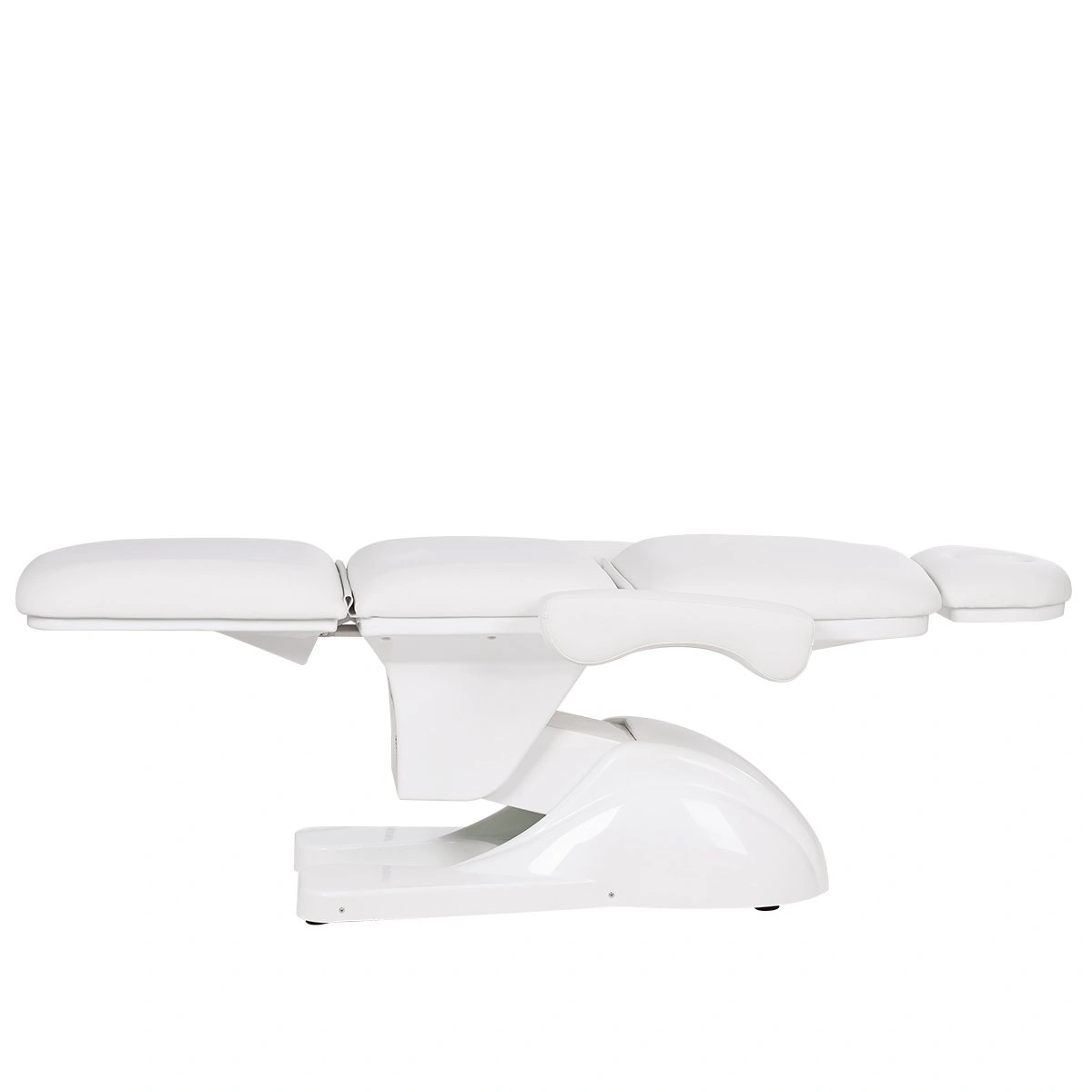 У кресла усиленный каркас из прочного металла с широким устойчивым основанием на подпятниках, конструкция полностью раскладывается в горизонтальное положение, имеются подголовник с отверстием для лица и съёмные регулируемые подлокотники. Модель можно использовать для различных процедур: косметология, наращивание ресниц, педикюр, оформление бровей и т.д.