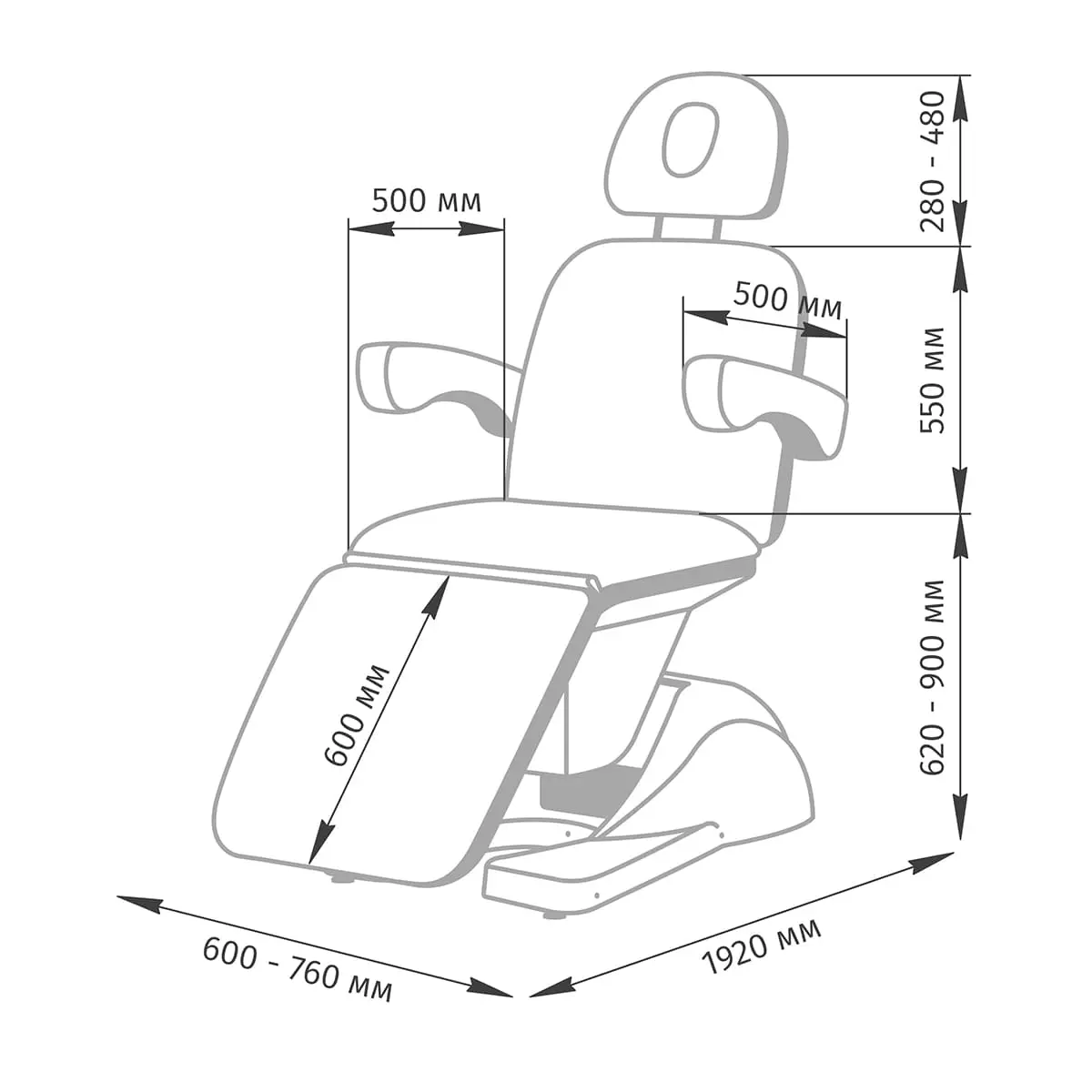Длина и ширина подлокотников: 500 и 80 мм;