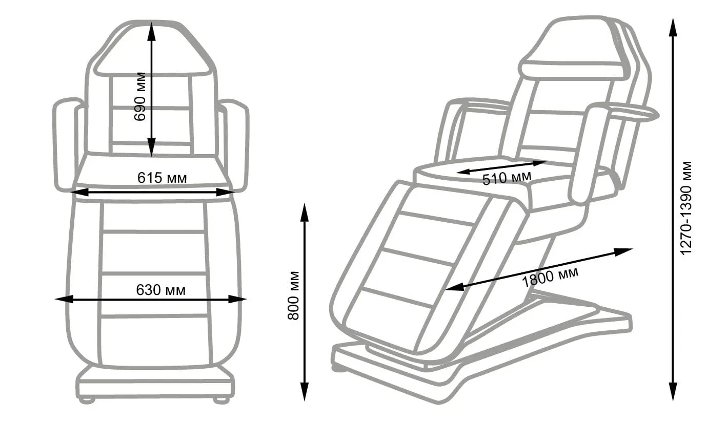 Комплектация: каркас с широким основанием на подпятниках, сиденье, спинка с вырезом для лица и съемным подголовником, мягкий элемент для ног, съемные подлокотники, электропривод (3 мотора).