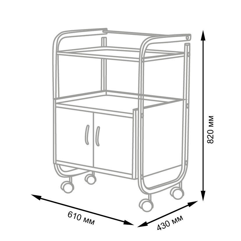 Комплектация: каркас, верхняя полочка, тумба, закрывающаяся дверками, вращающиеся колеса.