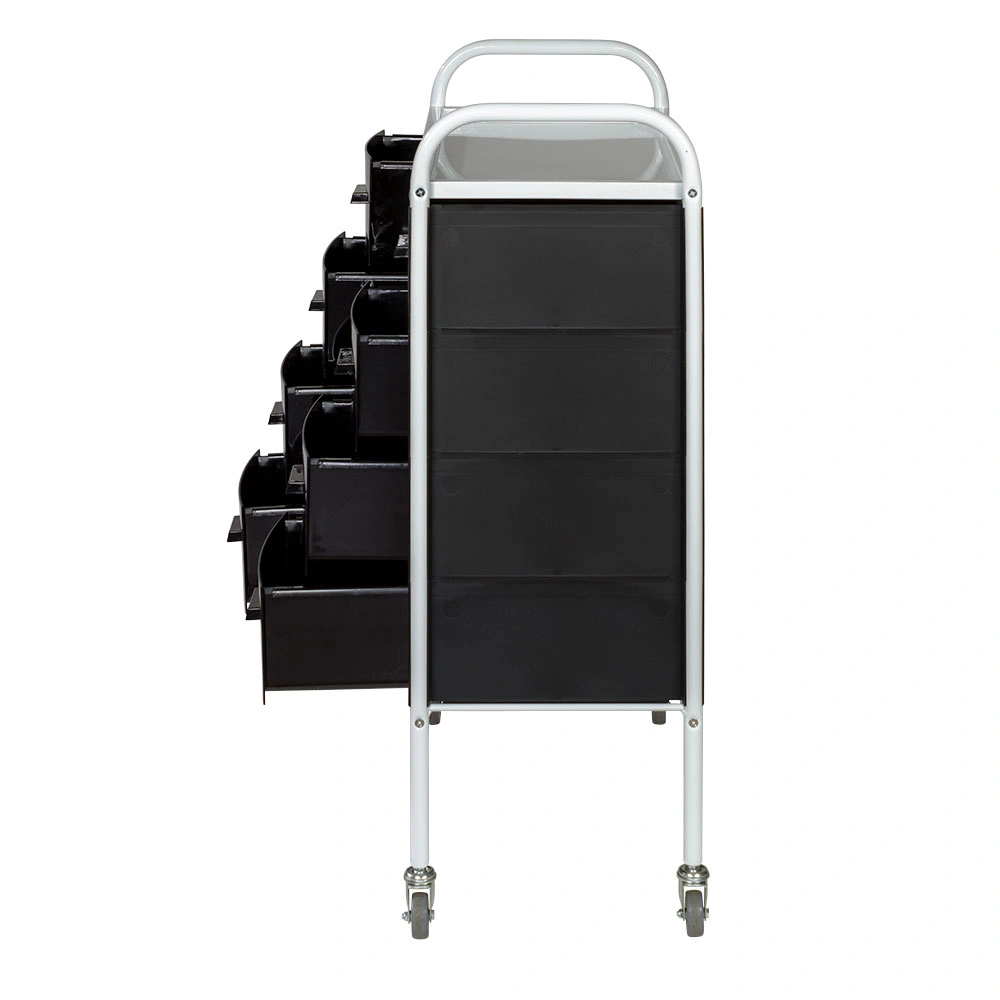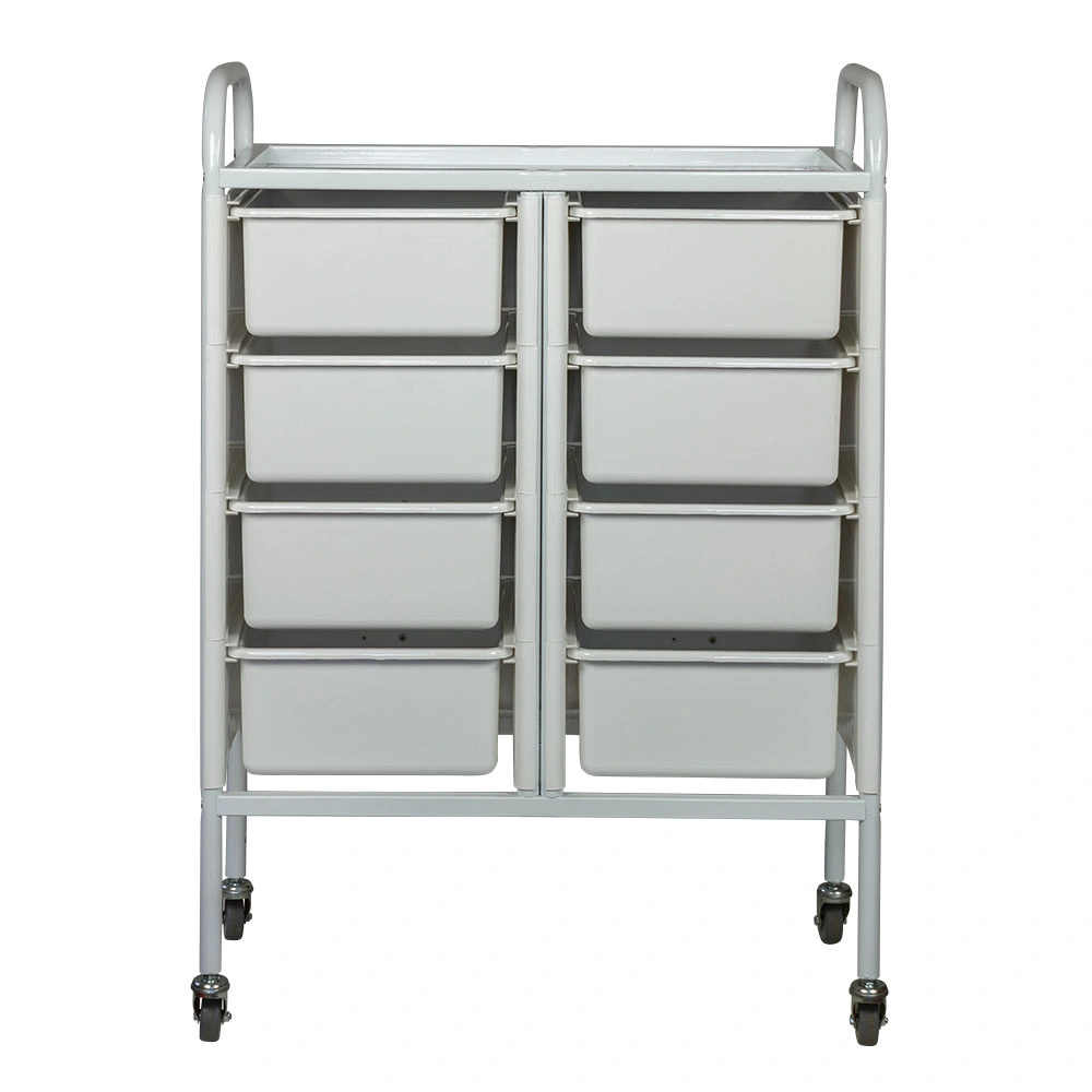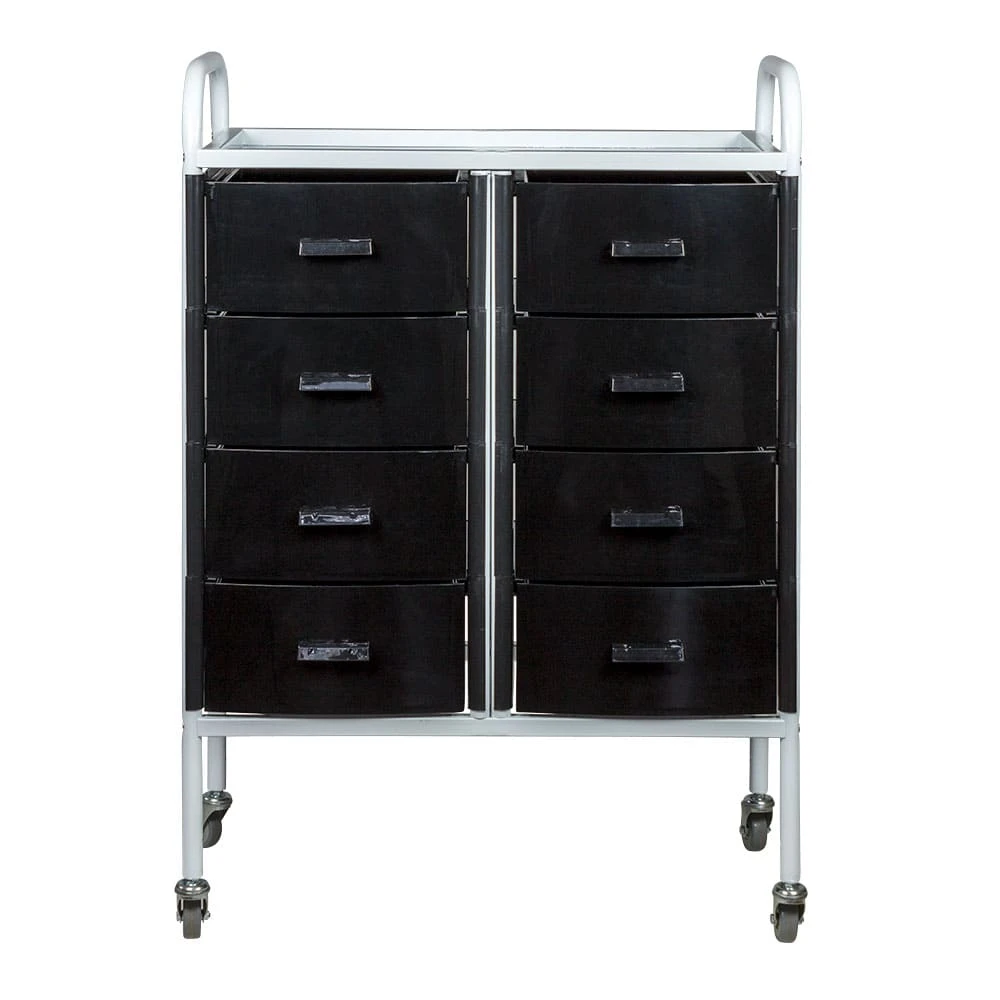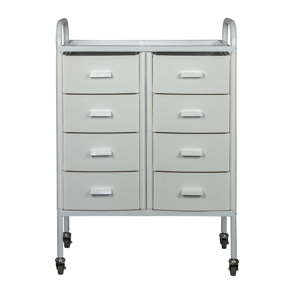 Такое косметологическое оборудование подойдет для организации двух рабочих мест. В распоряжении мастеров 8 выдвижных ящиков для инструментов и расходных материалов. Верхняя полка предназначена для приспособлений, используемых во время проведения процедур. Встроенные маневренные колеса позволят мастеру с легкостью перемещать косметологическое оборудование.