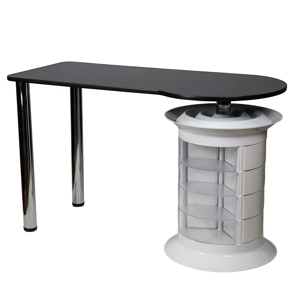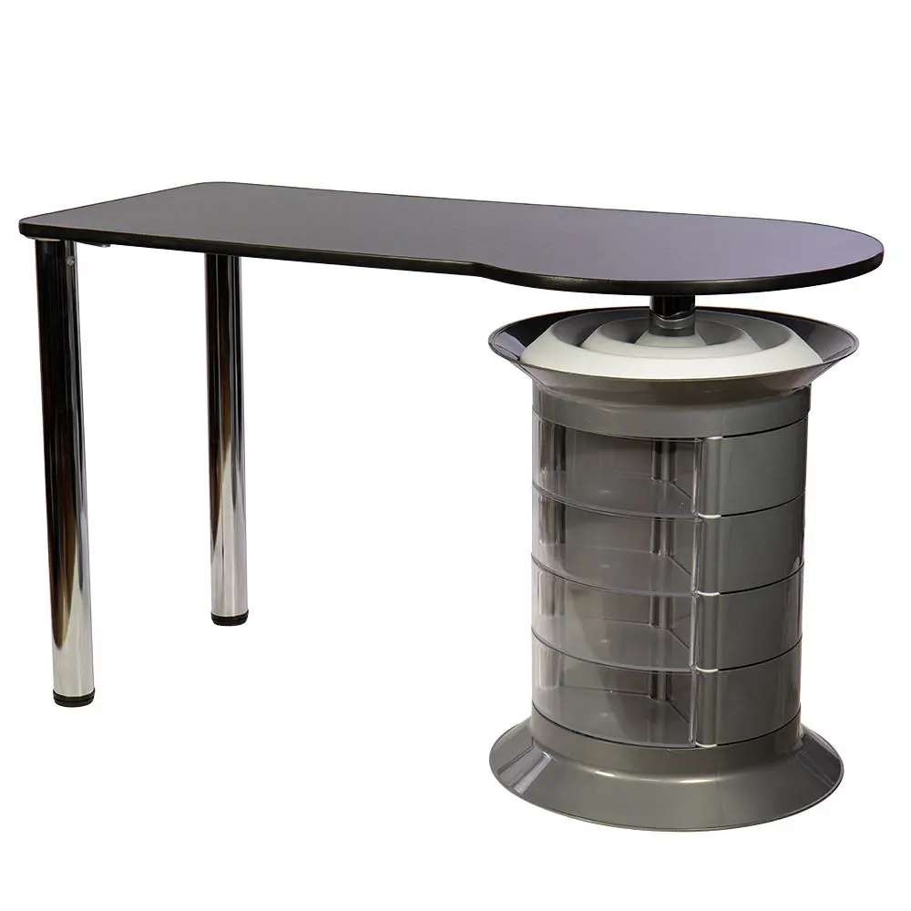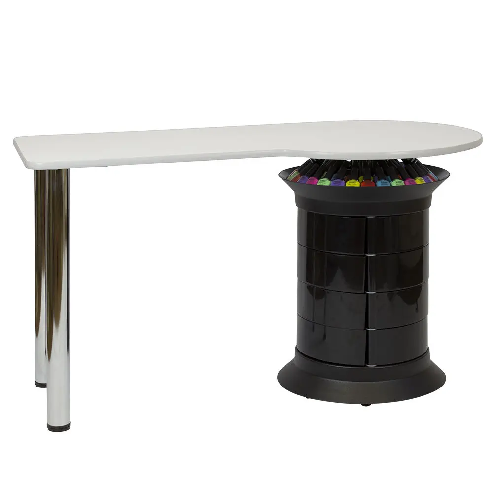 Инструменты, расходные материалы и аксессуары можно хранить в удобных выдвижных ящичках. Мастер сможет с легкостью находить необходимые приспособления, ведь тумбу можно вращать вокруг своей оси. Для лаков над тумбой предусмотрена удобная полочка. С широкой столешницей есть возможность поставить необходимое сопутствующее оборудование, не загромождая рабочую поверхность.