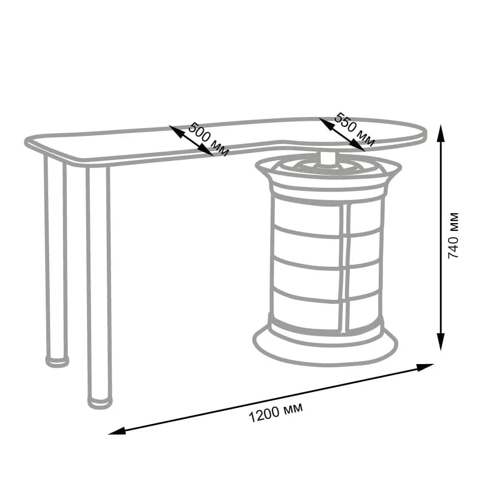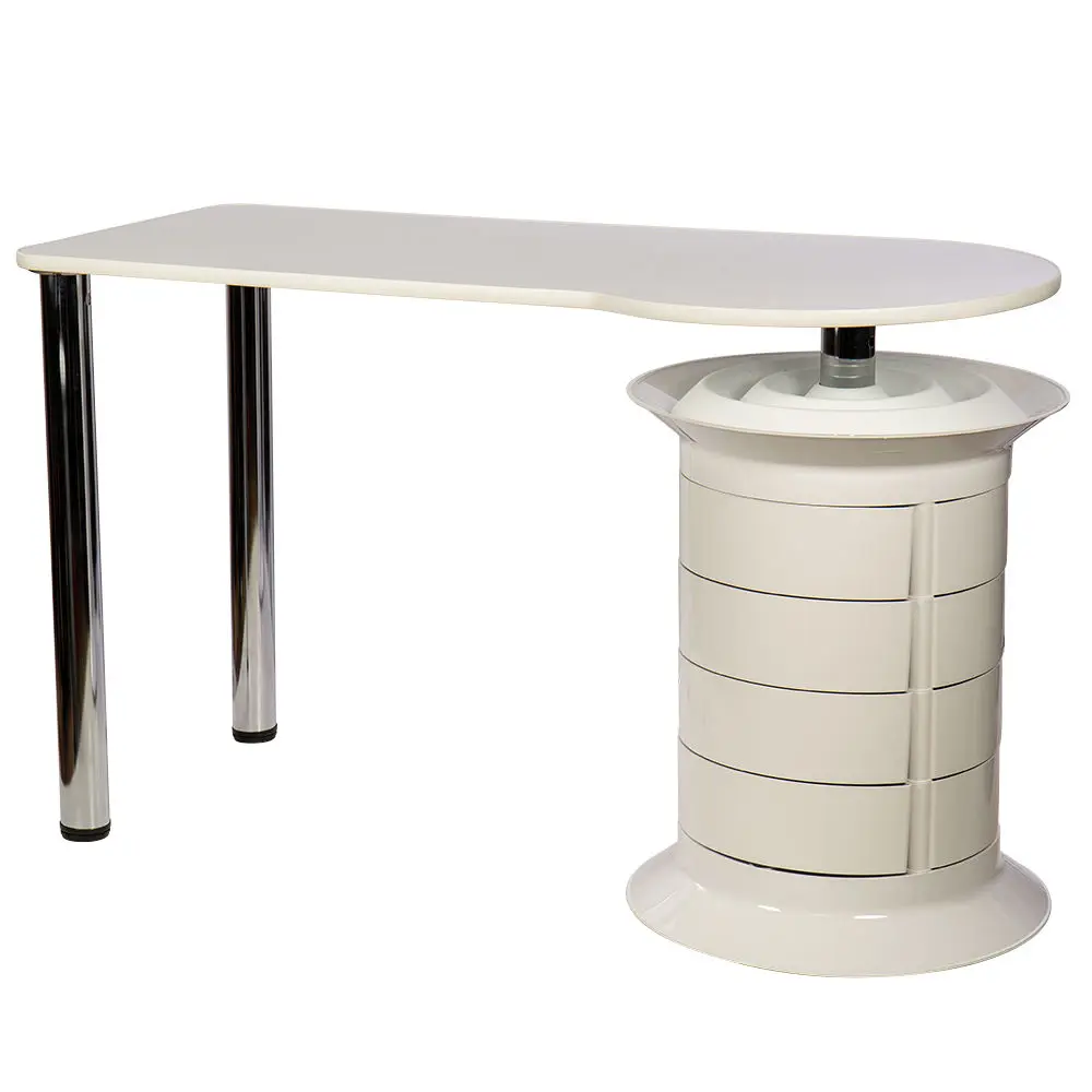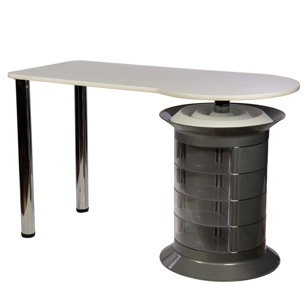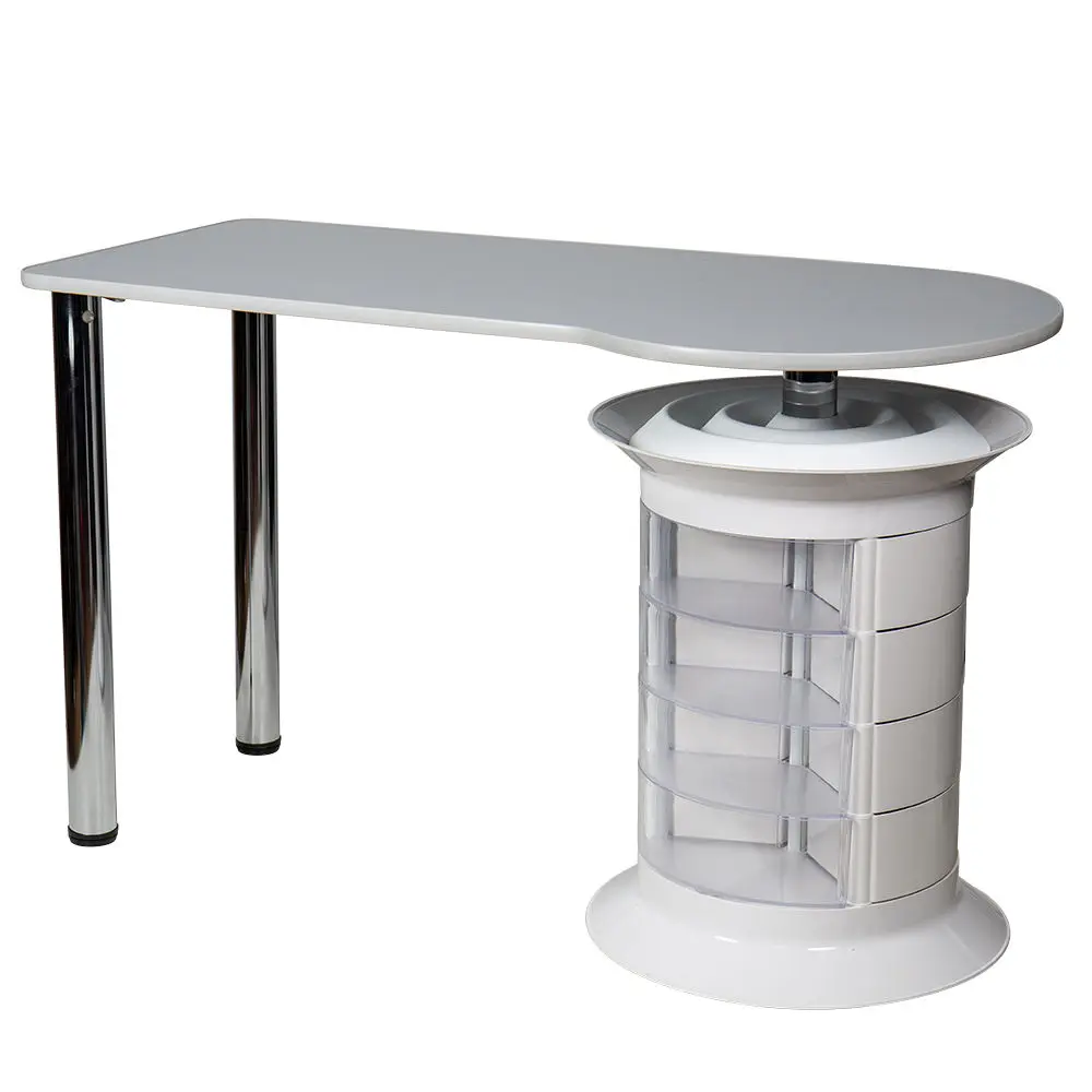 Инструменты, расходные материалы и аксессуары можно хранить в удобных выдвижных ящичках. Мастер сможет с легкостью находить необходимые приспособления, ведь тумбу можно вращать вокруг своей оси. Для лаков над тумбой предусмотрена удобная полочка. С широкой столешницей есть возможность поставить необходимое сопутствующее оборудование, не загромождая рабочую поверхность.