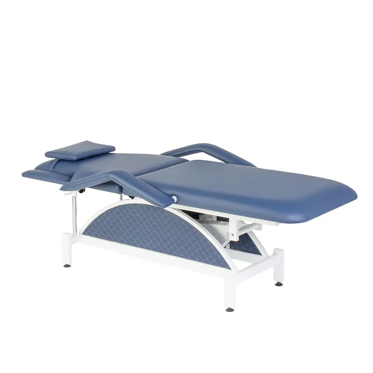 Кушетка разделена на два мягких сегмента, положение которых регулируется. С помощью двух встроенных электромоторов можно дистанционно регулировать угол наклона спинки и высоту кушетки. В комплект поставки входит удобный пульт управления электроприводом. Каркас и основание из металла с защитным покрытием.