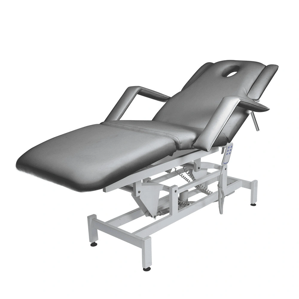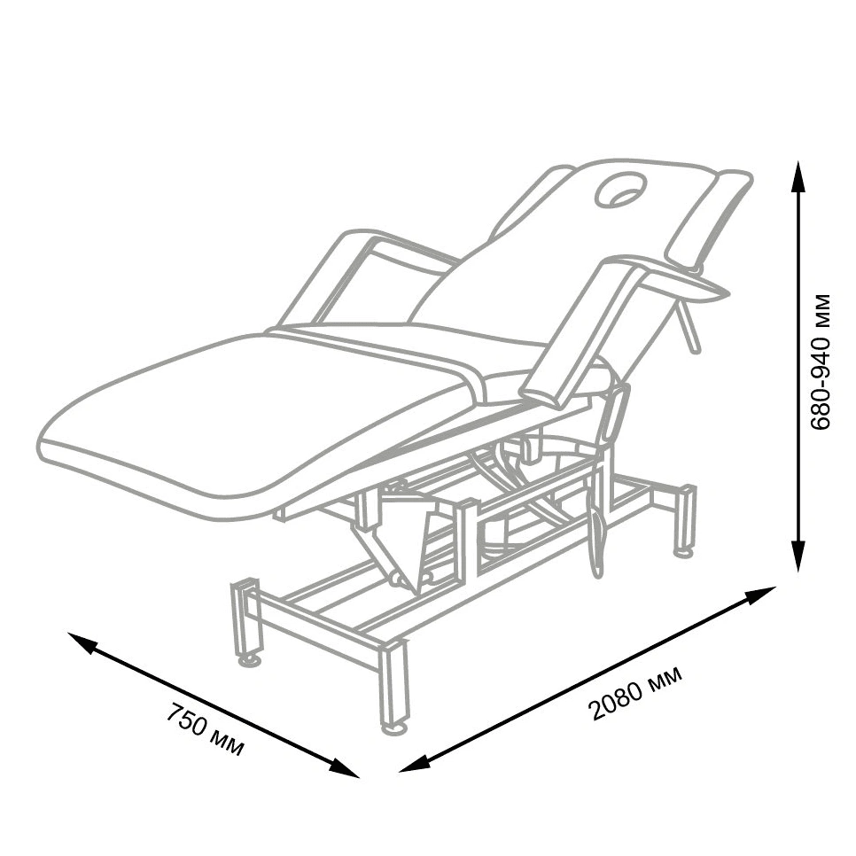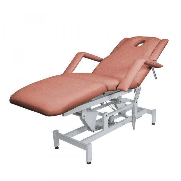 Кушетка массажная МД-849 (Элегия-3А) (электропривод, 3 мотора) – это профессиональное оборудование от компании МЭДИСОН. Она разработана для применения в массажном или косметологическом кабинете высокого уровня. Мягкая часть кушетки разделена на три сегмента: сиденье, спинка, элемент для ног. Это значительно повышает комфорт при использовании и обеспечивает необходимую функциональность во время работы. В спинке есть специальный вырез для лица. Для удобного расположения рук по время массажа предусмотрены навесные подлокотники, регулируемые по высоте. Размеры кушетки: