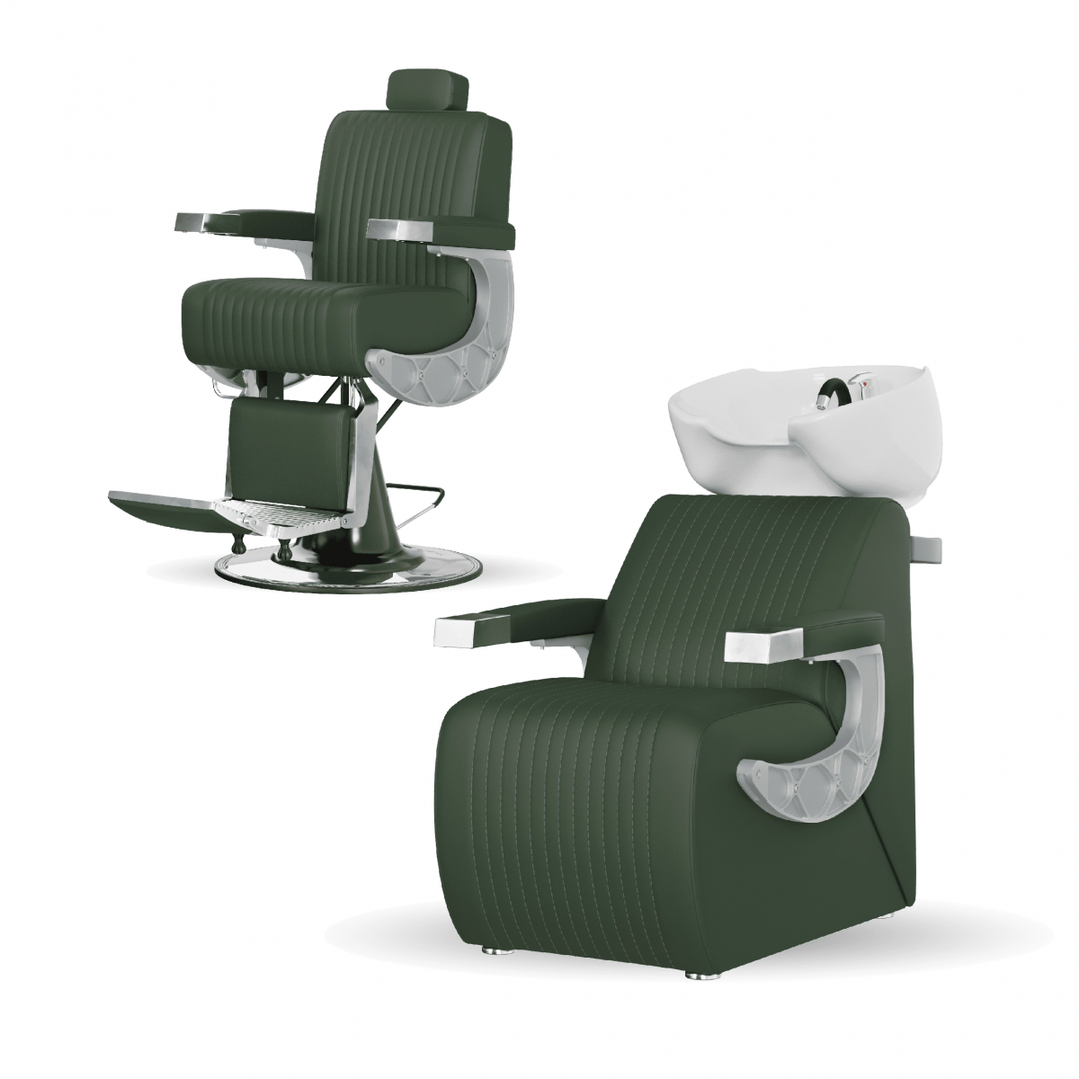 Комплектация мойки: раковина, сантехнические комплектующие, узел наклона раковины, каркас мойки, кресло, хромированные подлокотники с накладками под цвет кресла.