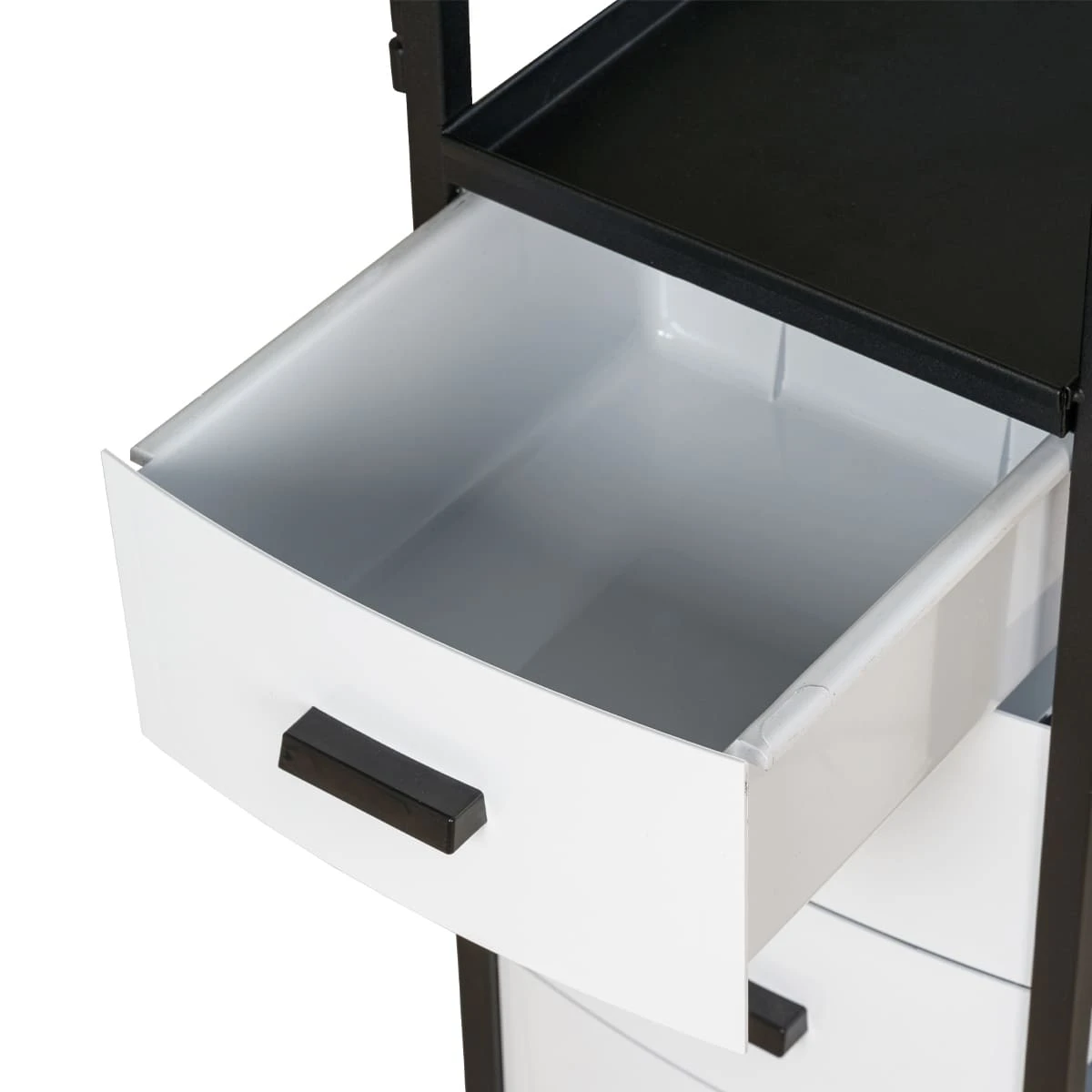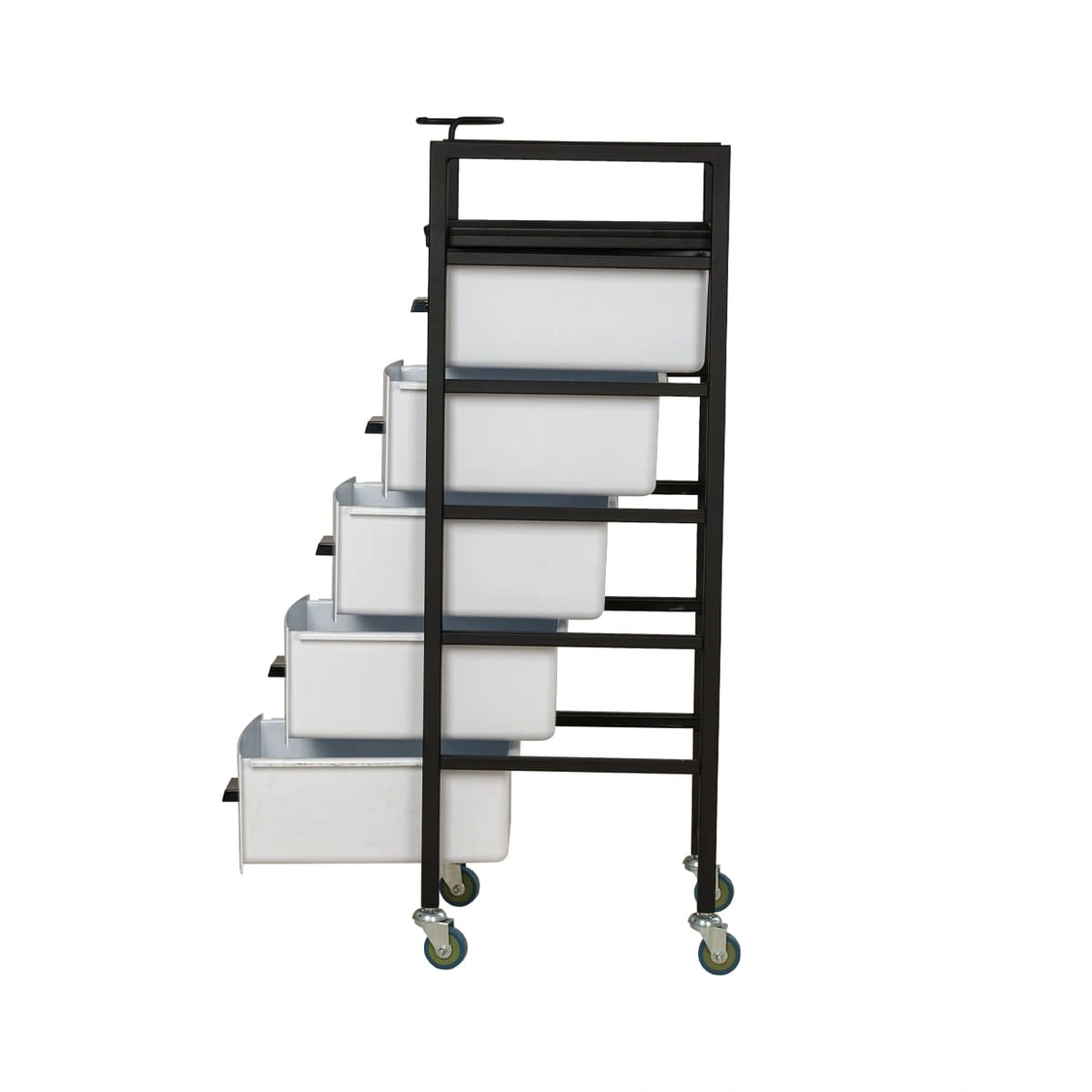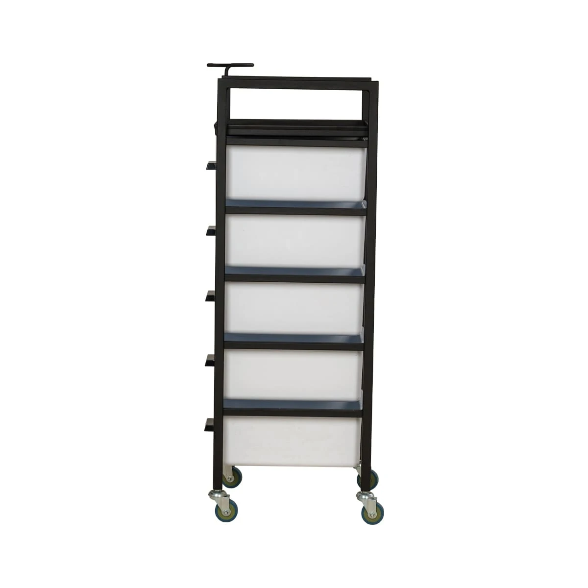Для принадлежностей в парикмахерской тележке есть пять выдвижных ящиков. Верхняя полка позволит мастеру держать под рукой инструменты, необходимые во время работы с клиентом. На боковине установлен практичный фенодержатель. Вращающиеся колесики обеспечивают плавное и практически бесшумное перемещение оборудования в пределах рабочей зоны.