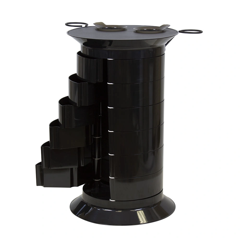 Верхняя крышка – также функциональный элемент оборудования. На поверхности предусмотрены отверстия для чаш и место для инструмента, необходимого во время рабочего процесса. Благодаря своей вместительности и двух держателей для фенов оборудование подойдет для обустройства нескольких рабочих мест. С помощью маневренных колесиков оборудование GiroCo можно с легкостью переместить в любое место.