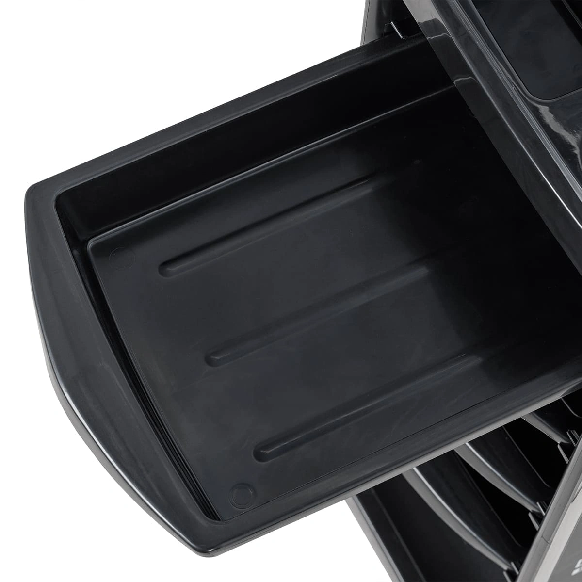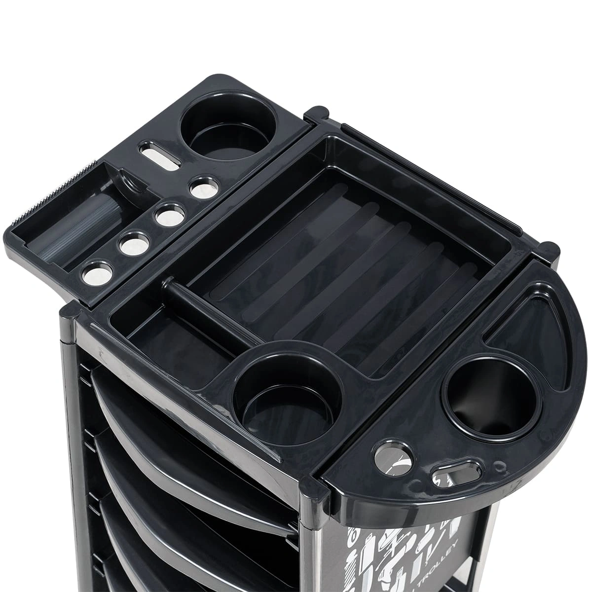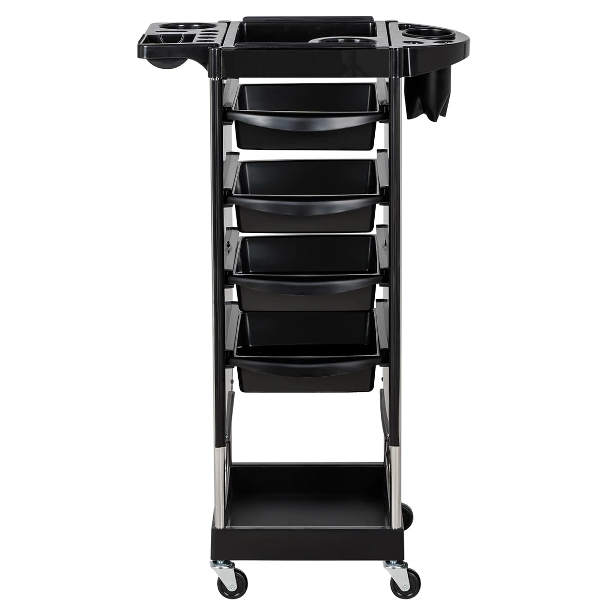 У парикмахерской тележки максимальная вместительность и универсальный дизайн, просторная верхняя крышка с отверстиями для брашингов и ёмкостей, 4 выдвижных ящика и нижняя полочка для инструментов и баночек красоты, это позволит мастеру организовать рабочее пространство и повысить эффективность работы.