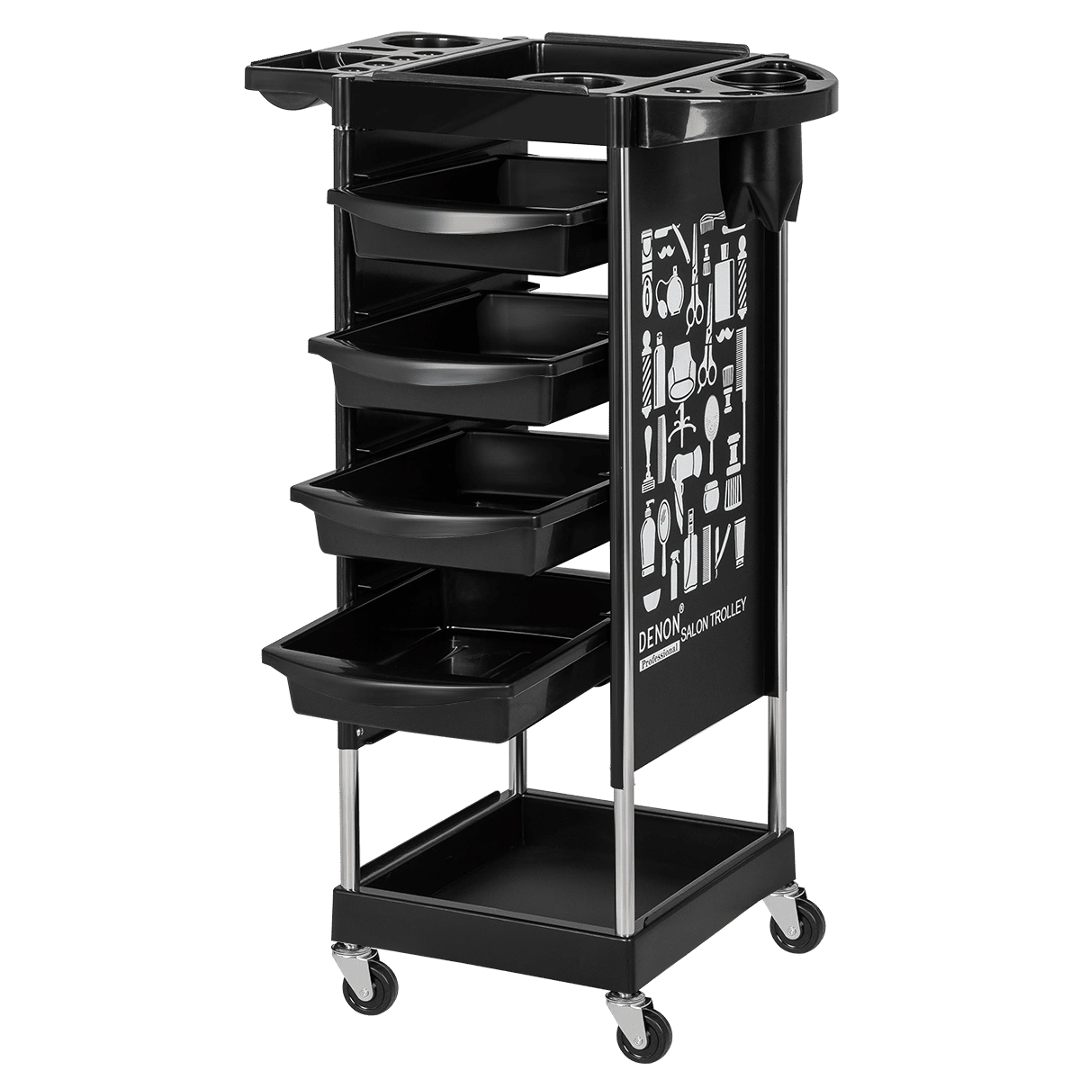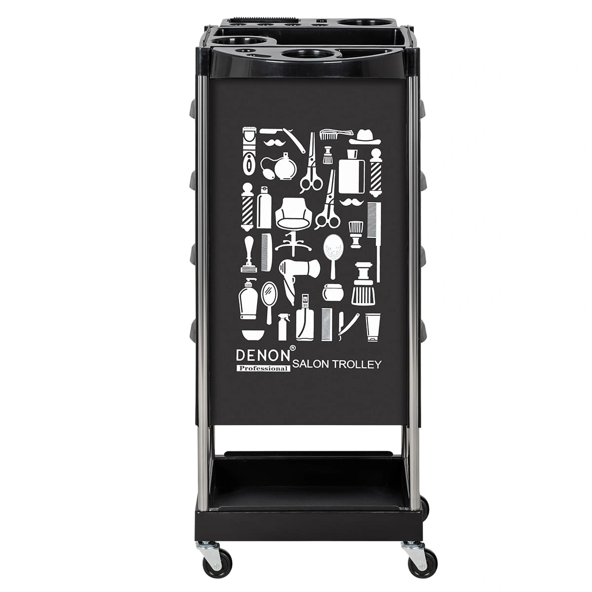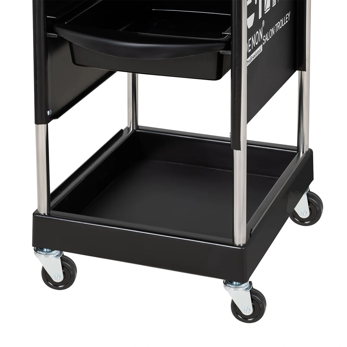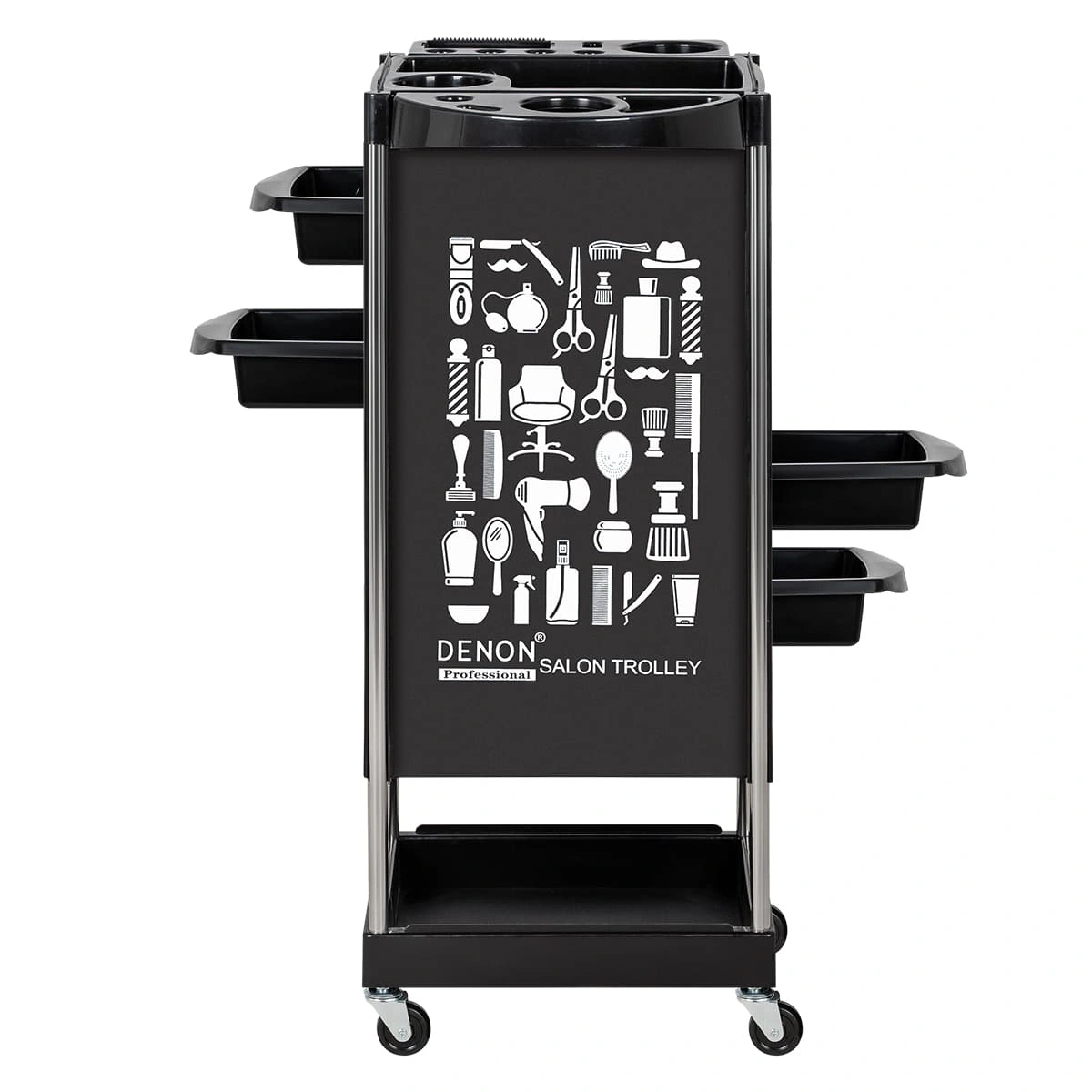 У парикмахерской тележки максимальная вместительность и универсальный дизайн, просторная верхняя крышка с отверстиями для брашингов и ёмкостей, 4 выдвижных ящика и нижняя полочка для инструментов и баночек красоты, это позволит мастеру организовать рабочее пространство и повысить эффективность работы.