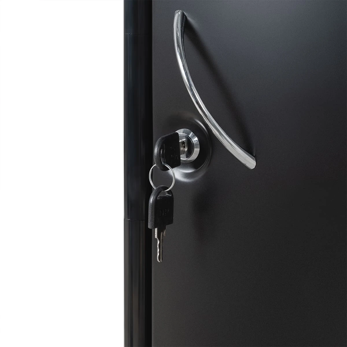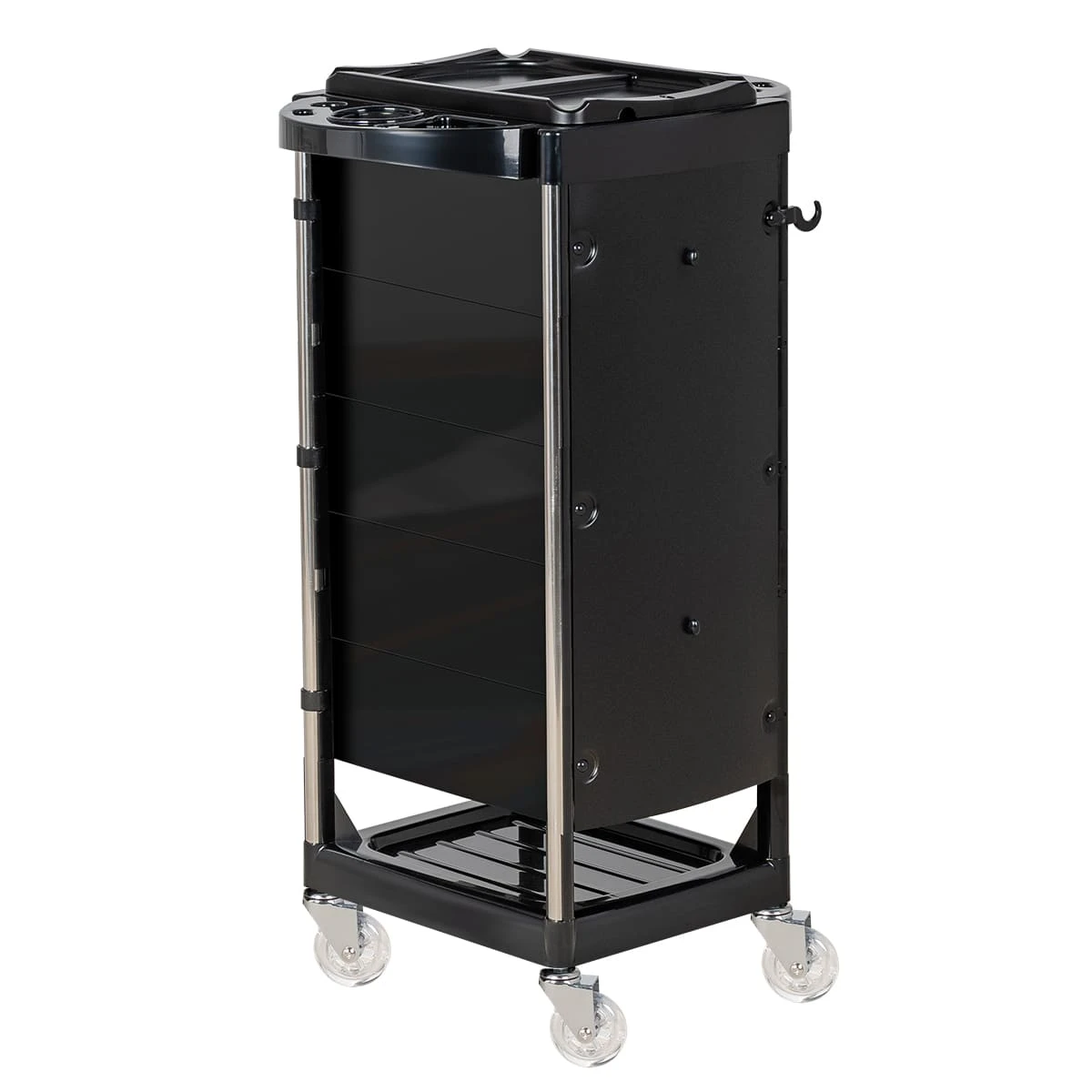 Верхняя крышка тележки с отверстиями для брашингов, фена и ёмкостей, двумя складными боковыми подставками и съёмной разделительной крышкой. Имеется 5 выдвижных вместительных ящиков и нижняя открытая полочка. Закрытые боковины и дверца с замком, обеспечивающие надёжность, защиту от влаги, пыли, волос и красящих элементов!