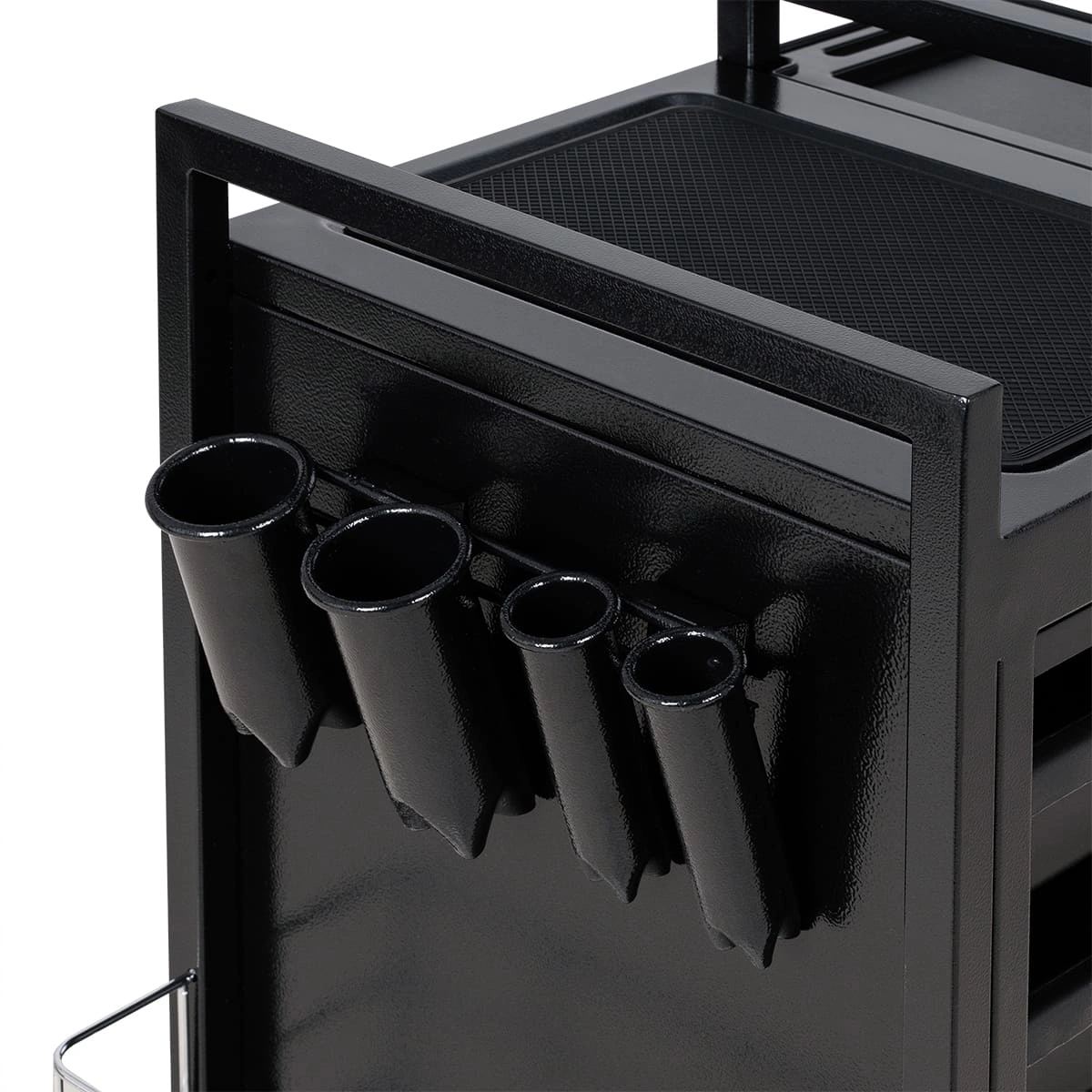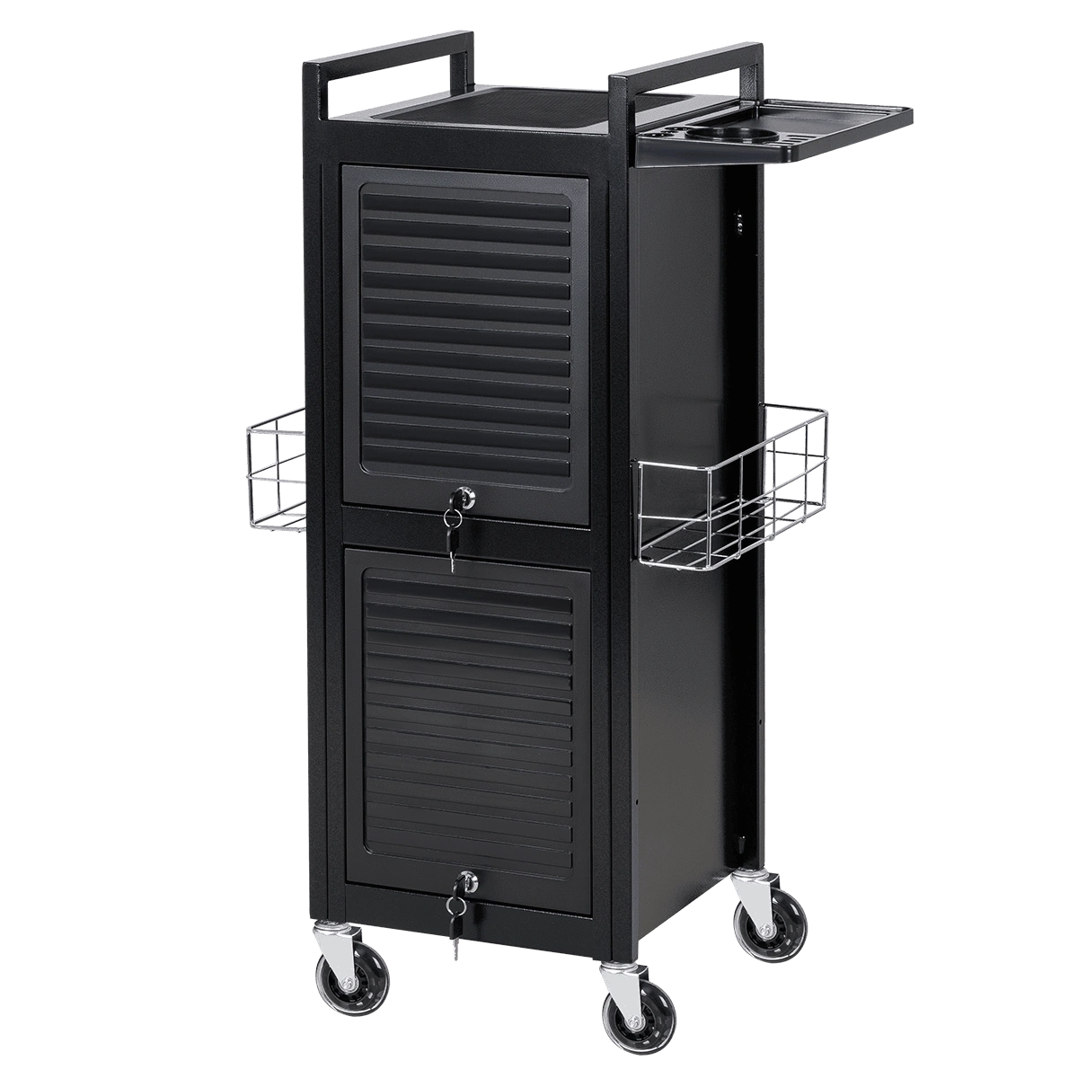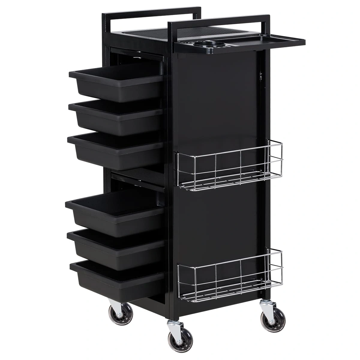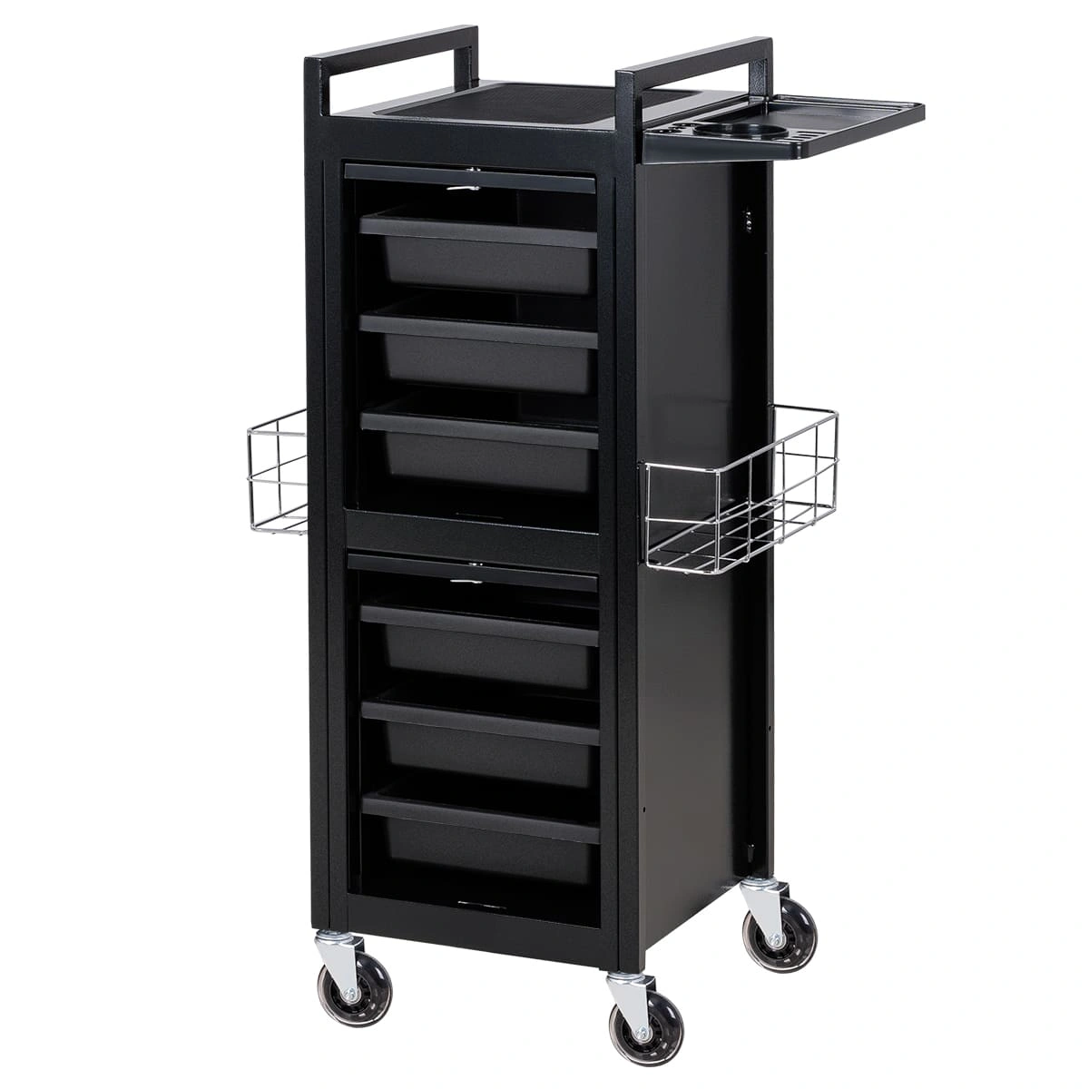 У парикмахерской тележки стильный прямоугольный дизайн с острыми углами. Верхняя многофункциональная полочка с ручками для перемещения, антискользящей ребристой поверхностью, держателем для фена и отверстиями для красок, брашингов и инструментов. Шесть выдвижных ящиков, закрывающихся на ключ, и боковые съемные сетки для хранения рабочих принадлежностей. Боковины и задняя стенка полностью закрывают внутреннее пространство для ящиков, что делает тележку практичной и удобной в работе.