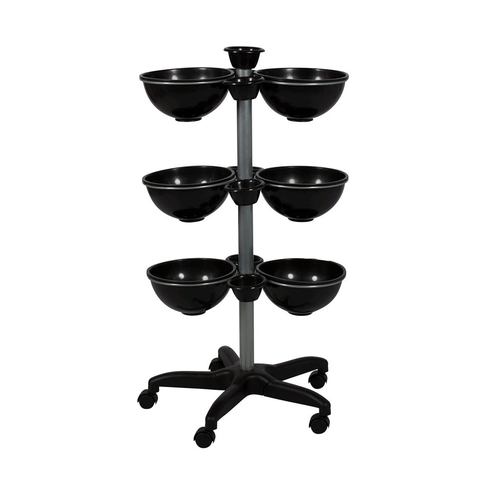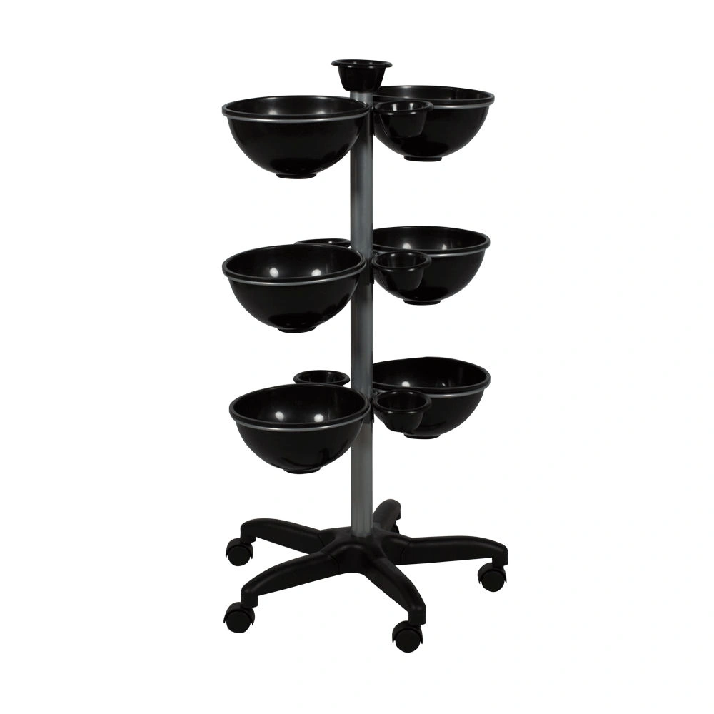 Тележка для аксессуаров Т-100 от компании МЭДИСОН. В комплектацию входит металлическая стойка на пятилучье с колесами. К стойке на разной высоте прикреплены чаши: 6 больших и 6 маленьких. Дополнительная маленькая чаша установлена сверху стойки. Такая конструкция обеспечивает максимальное удобство во время работы. Мастер может с легкостью поворачивать тележку и передвигать ее по помещению. Эту тележку Вы сможете взять с собой на различные конкурсы мастерства и другие мероприятия, ведь данная модель является разборной.