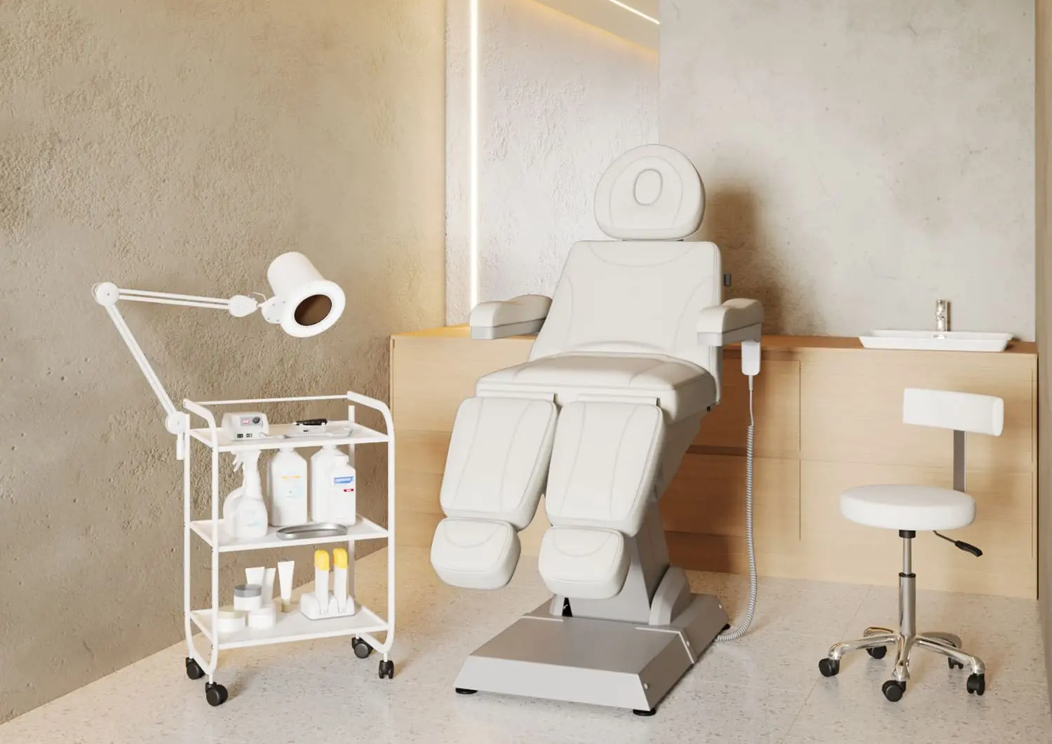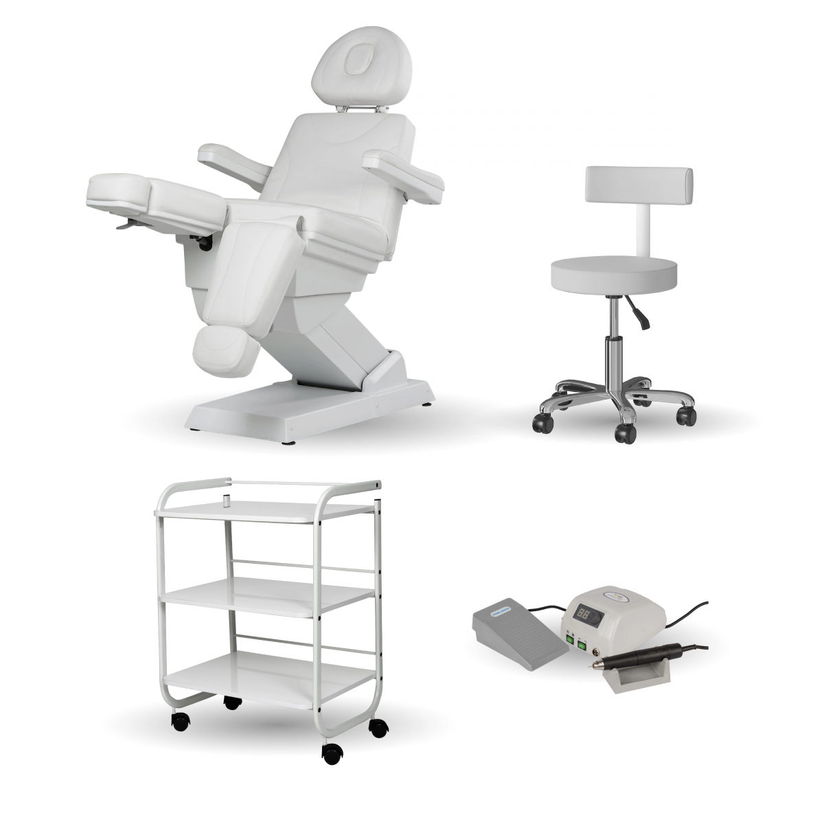 Комплект мебели и аксессуаров для педикюрного кабинета собран профессионалами для обустройства педикюрных и универсальных косметологических кабинетов. В нем есть все необходимое для эффективной и слаженной работы: удобное педикюрное кресло на электроприводе, стул для специалиста, столик косметолога и аппарат для маникюра/педикюра.