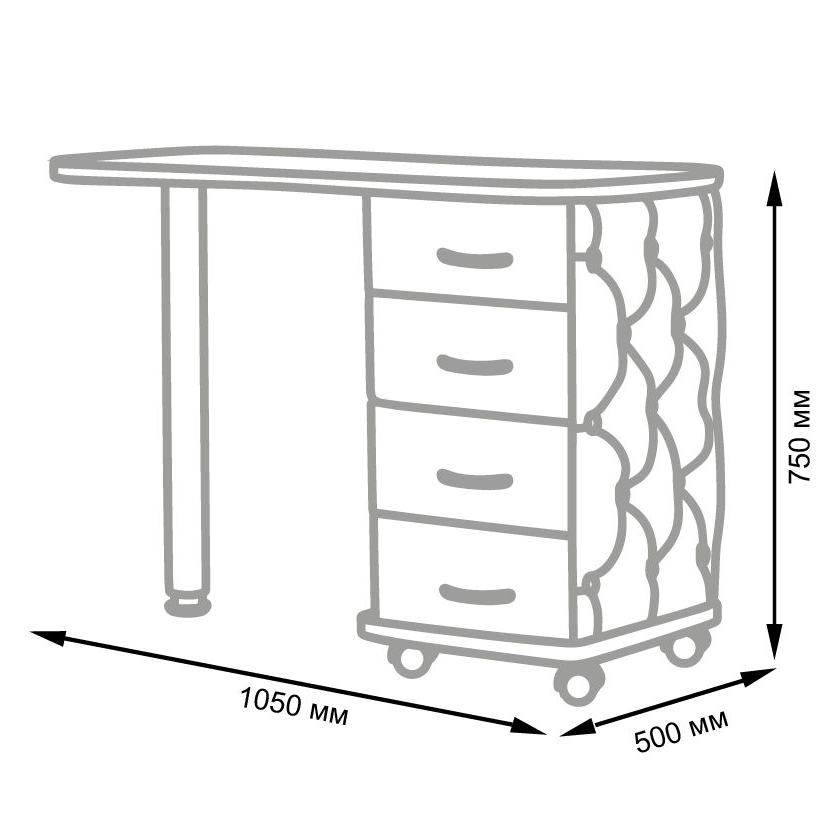 Комплектация: столешница, тумба, четыре выдвижных ящика, стальная ножка, колеса.