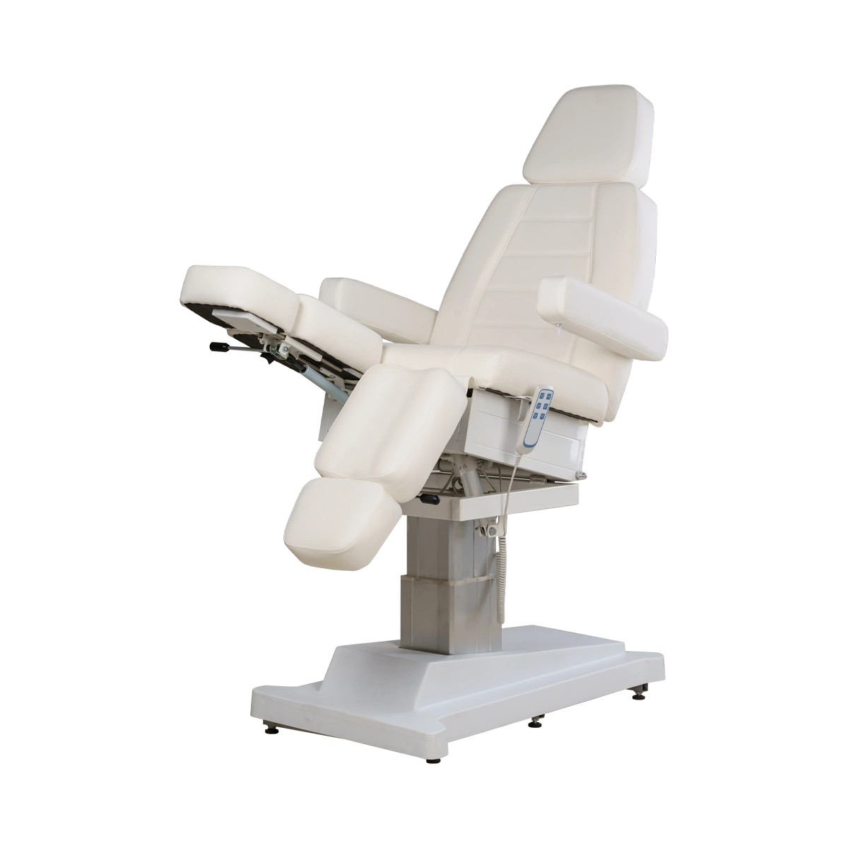 И те самые улучшенные характеристики: регулировка высоты подъема осуществляется с помощью мотора, расположенного внутри колонны. Кресло на колонне имеет элегантный и завершенный образ. Регулировка ножек кресла осуществляется с помощью пневматики, что намного облегчает работу мастера!